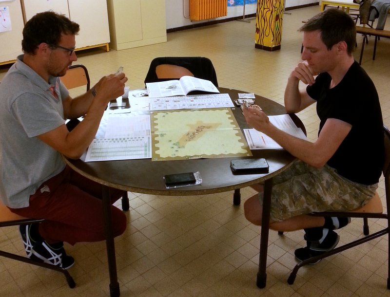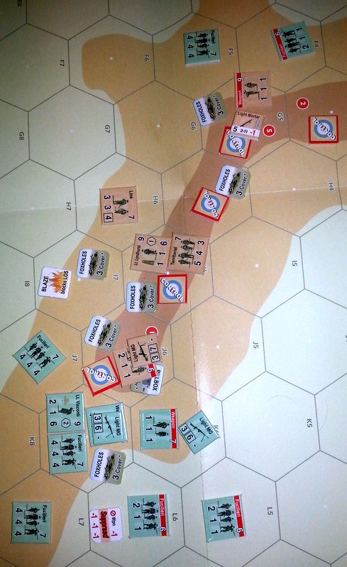 Laurent ouvre le bal par un fort barrage d'artillerie (le scénario lui accorde d'entrée 2 cartes "artillery request" dans sa main de 6 cartes -attaquant-). Il matraque les positions de Bruno et parvient à "breaker" un de ses leaders (caporal Singh). Le repérage des cibles et le recours à l'artillerie mobilisent toutes les actions des deux leaders italiens qui parallèlement ne pourront lancer d'autres ordres. Les italiens ne progressent donc pas encore.