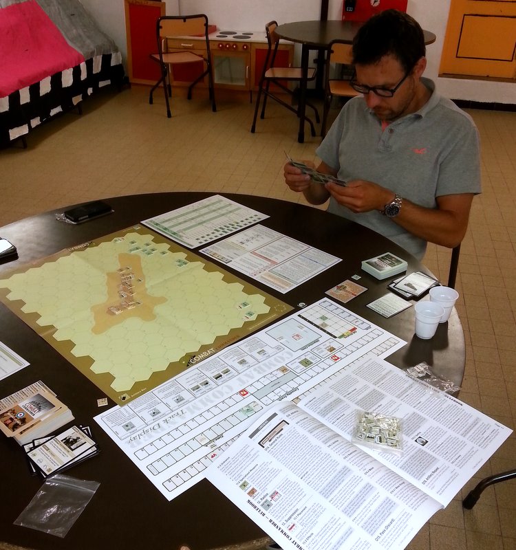 J'ai également eu mon lot de disette. Une seule carte "advance", donc un CàC possible, durant toute la partie ! Ce fut un vrai problème pour un scénario qui me pousse à monter à l’assaut. J'ai donc en grande partie gagné grâce aux tirs et à Bruno qui sûr de lui (trop ?) est venu au contact alors que j'étais bardé de "ambush" (action gagnante pour CàC). Il est clair que le côté poker est bien présent dans CC. Ce n'est pas pour me déplaire vu le nombre incalculable d'heures que j'ai passé autour d'une table de texas hold'em !
