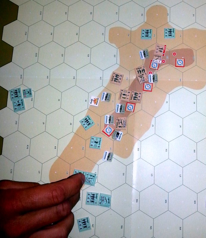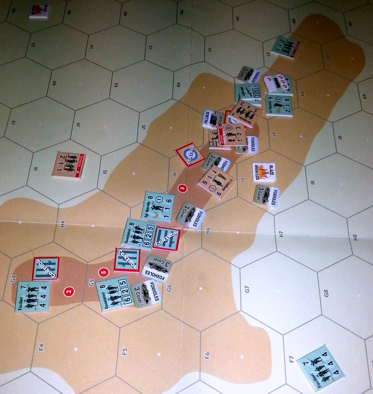 Pour ce qui est de l'attaque de flanc italienne, elle a bien fonctionné mais elle a été coûteuse en ordres... ce qui aurait pu être évité avec la présence d'un leader (qui pouvait être le sergent Marcello à partir de son arrivée au premier tour).