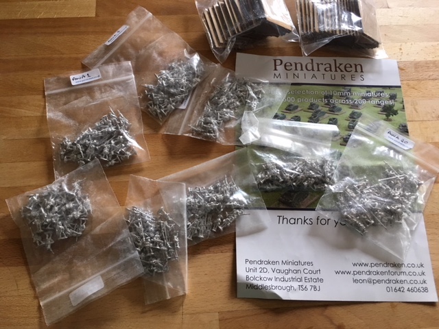 J’ai choisi le 10 mm pour plusieurs raisons. D’abord pour le plaisir de peindre une échelle que je n’ai jamais peinte. Ensuite, pour la beauté et le catalogue pléthorique du fabriquant Pendraken. Pour également l’envie de peindre une armée plus rapidement que du 28 en alignant malgré tout sur la table des centaines de figurines. J’espère pouvoir réaliser un effet de masse que je cherche pour nos jeux sans avoir l’impression qu’il y a trop de fig’s au cm2. Ensuite le prix ! Rien à dire à ce niveau. Avec cette première livraison j’assure la moitié de l’armée pour 50 euros. Imbattable ! Enfin, la place. Elle se fait rare chez moi, le stockage d’une armée en 10 mm est beaucoup plus simple.
