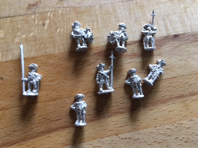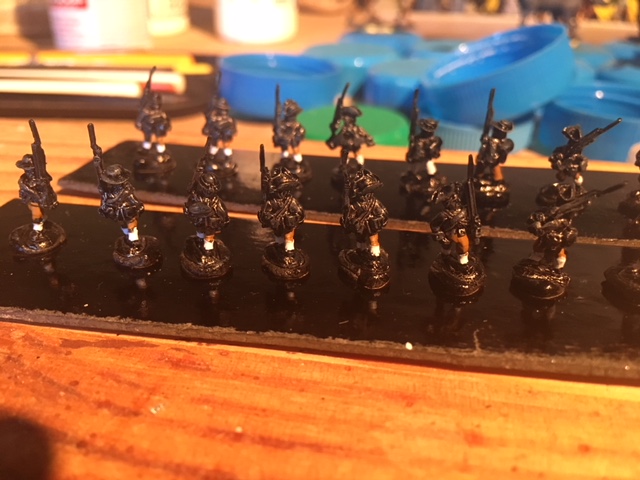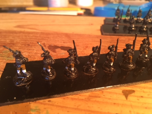 Ca sera afin d'être jouable en Tricorne comme en Black Powder; des bases de 40X30 mm avec 8 figurines dessus. Pour l'infanterie légère et rifle je pense descendre à 5 toujours en deux rangs mais décalés 3 devant 2 derrière. Pour la milice, pas encore arrêté mais je penche pour 7 en désordre.
